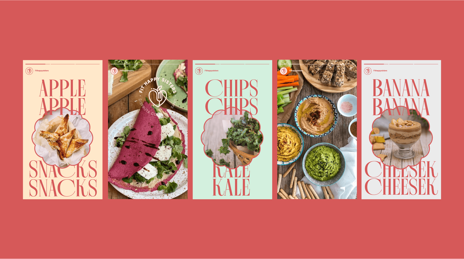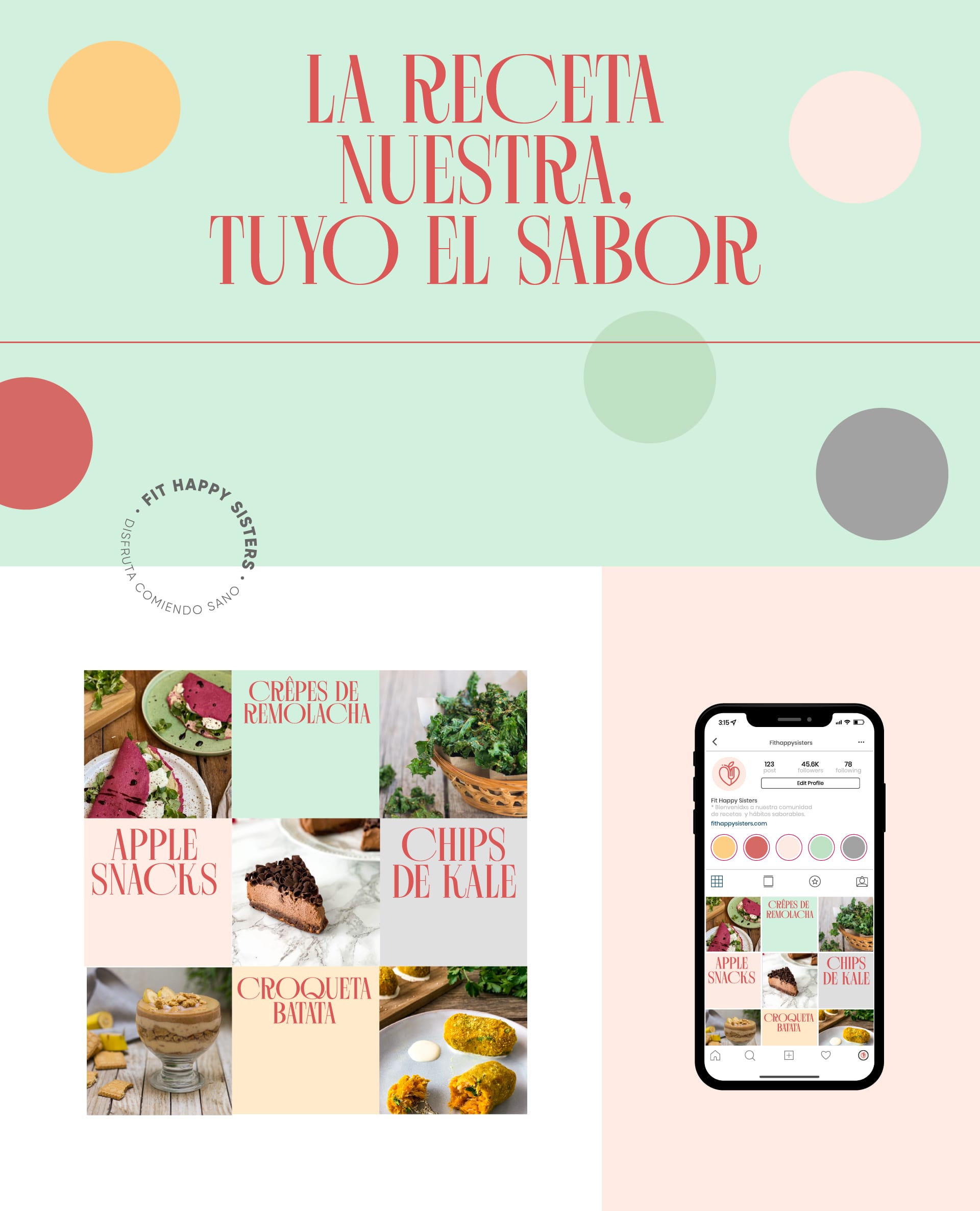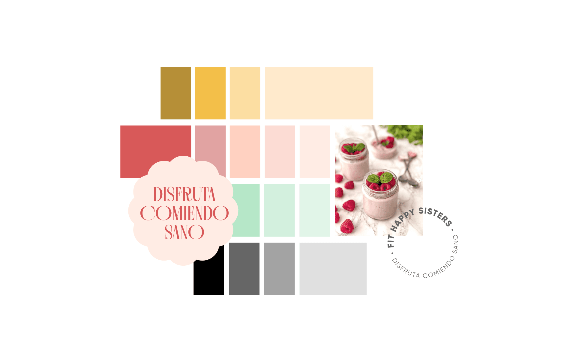 Por esta razón, se ha definido una imagen simple con un pictograma que combina todos estos conceptos: cocina, salud y bienestar. Transmite satisfacción, alegría y el poder de cambiar el estilo de vida de estas dos hermanas. Este concepto, junto con los colores corporativos principales, otros colores secundarios, el claim y los iconos de alimentos, dará lugar a una identidad variable nueva, cercana y diferenciada de la competencia, abordándola desde la esencia y filosofía que definen a Fit Happy Sisters.