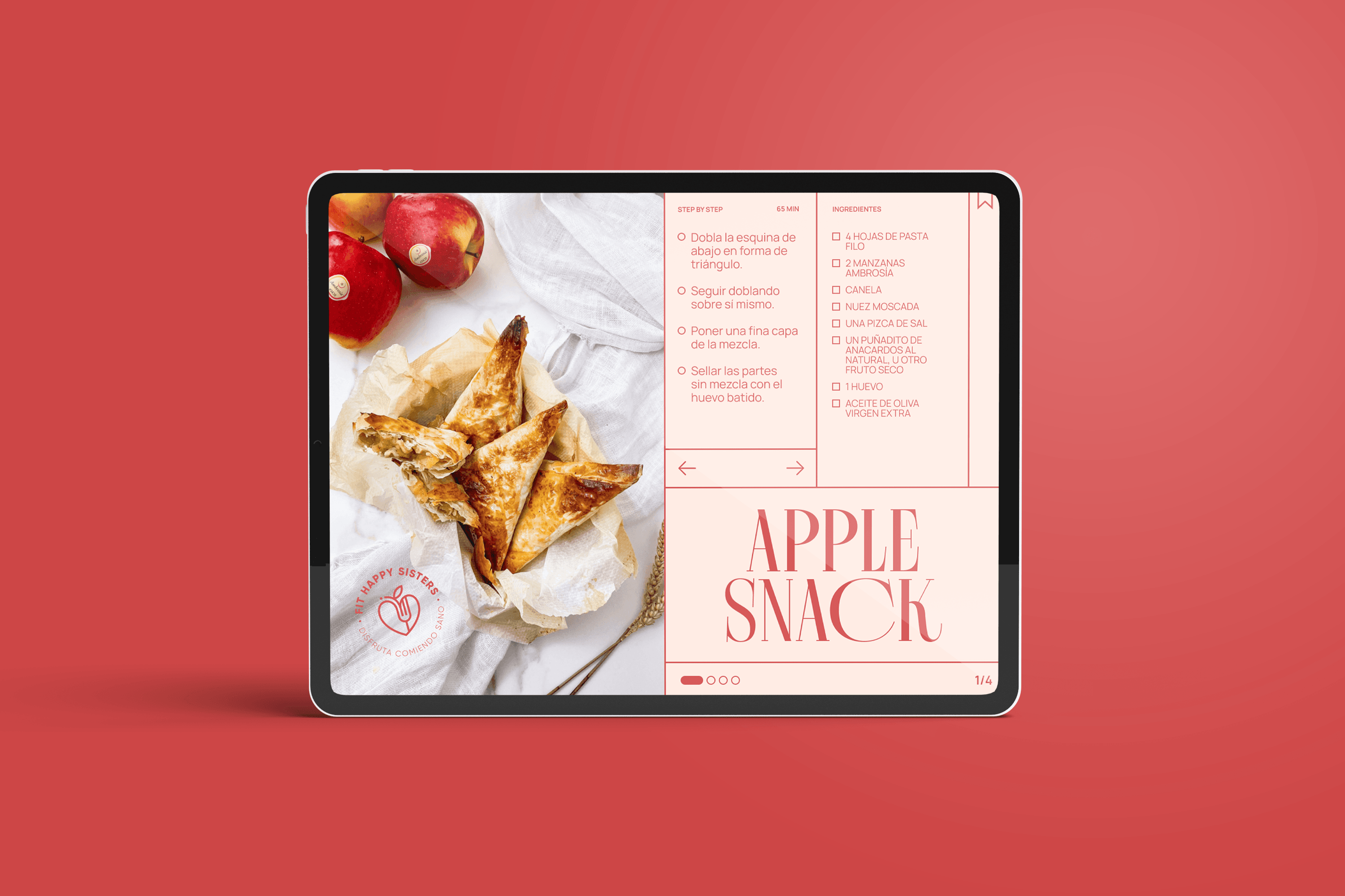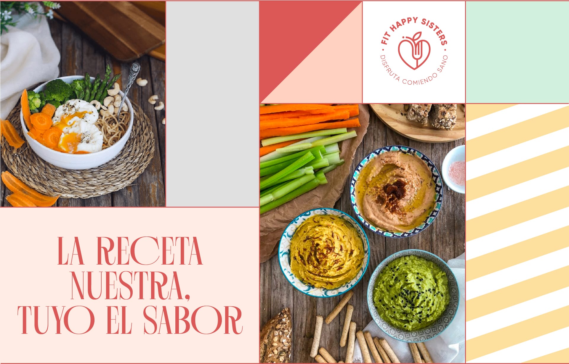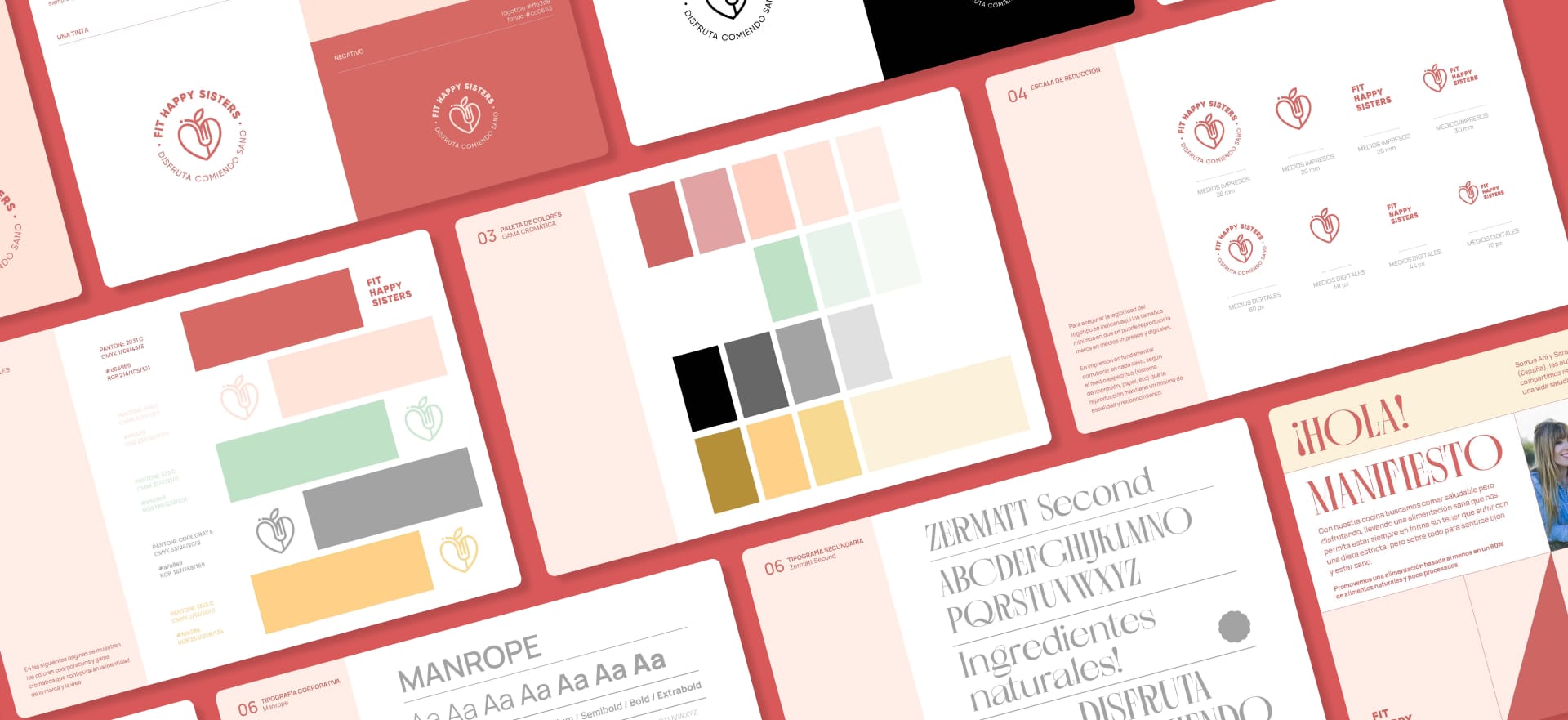 Por esta razón, se ha definido una imagen simple con un pictograma que combina todos estos conceptos: cocina, salud y bienestar. Transmite satisfacción, alegría y el poder de cambiar el estilo de vida de estas dos hermanas. Este concepto, junto con los colores corporativos principales, otros colores secundarios, el claim y los iconos de alimentos, dará lugar a una identidad variable nueva, cercana y diferenciada de la competencia, abordándola desde la esencia y filosofía que definen a Fit Happy Sisters.